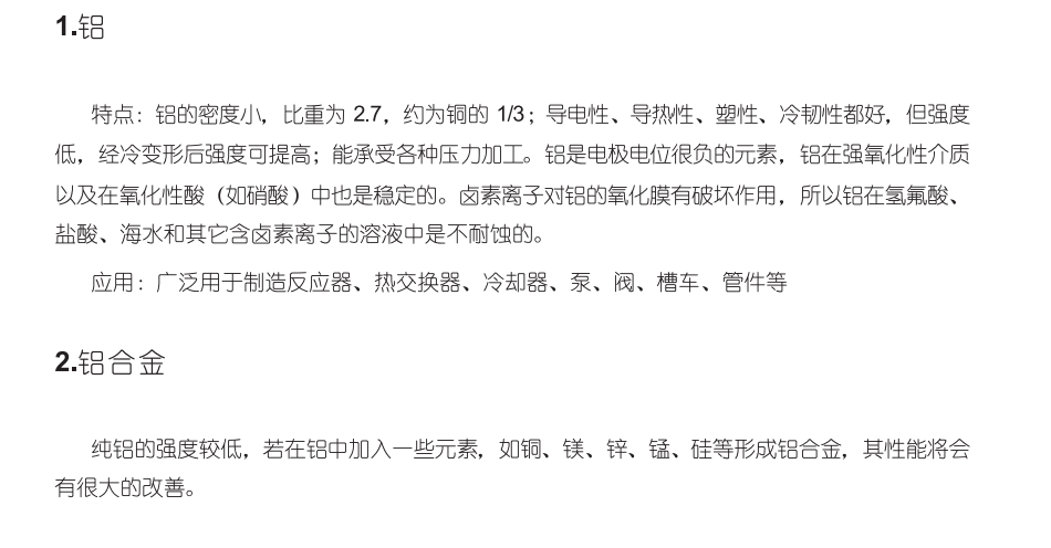 工業(yè)上鋼鐵稱為黑色金屬,除鋼鐵以外的金屬稱為有色金屬。有色金屬及其合金因具有良好耐腐蝕性和低溫性能,常用來制造水處理、化工容器及有關(guān)的設(shè)備零件部。